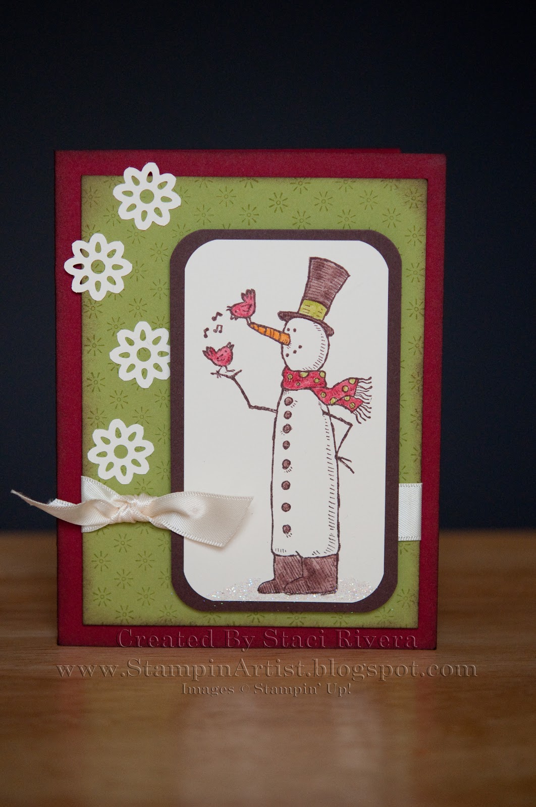 I used blender pens and the ink pads to color the snow man. I used the centers of the Lace Ribbon Border Punch to create the snowflakes. Just punch a strip of the lace ribbon punch and then clip out the center pieces. In this close-up you can see that I used the starburst wheel on the Lucky Limeade layer.